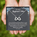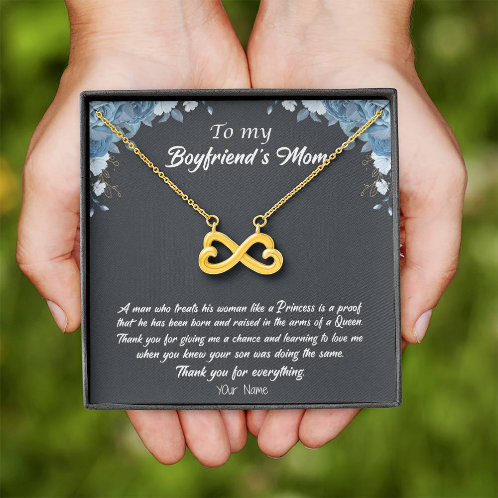 Show your boyfriend's mom how much she means to you with the Endless Love Necklace—a timeless symbol of love and affection. Artisan-crafted in your choice of a 14k white gold finish or 18k yellow gold finish, this heart-shaped infinity symbol represents the promise of endless love. Hand-polished to perfection, this necklace radiates a magnificent shine and is designed to be worn elegantly on its side, making it a perfect gift for a mother who deserves something truly special. Personalize this beautiful piece with a custom name on the message card and a custom message to make it even more meaningful.